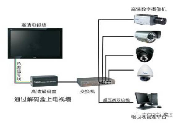 数字视频监控系统由于前端采用的是数字摄像机,视频信号在摄像 机中已经完成编码的过程,在整个网络中都是以数字信号的形式进行传输,所以在后端无需安装视频采集卡或者相关编码设备,可以直接存储,并且通过高清解码器输出到液晶电视上显示。