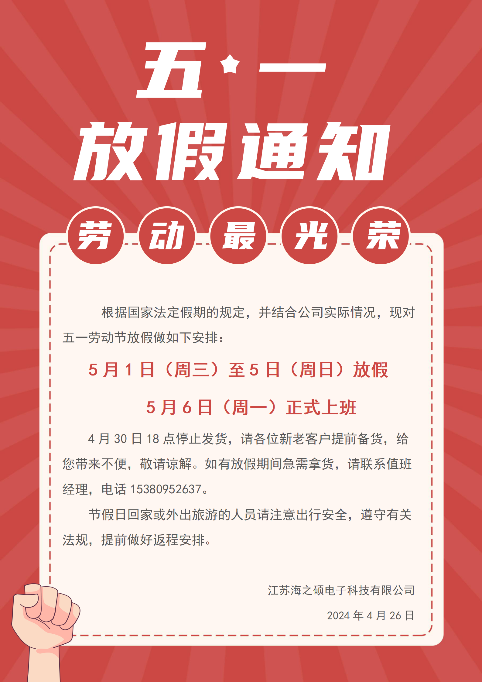 4月30日18点停止发货,请各位新老客户提前备货,给您带来不便,敬请谅解。如有放假期间急需拿货,请联系值班经理,电话15380952637。